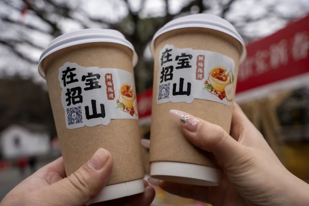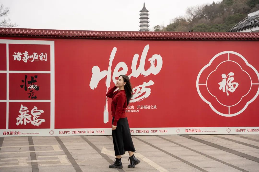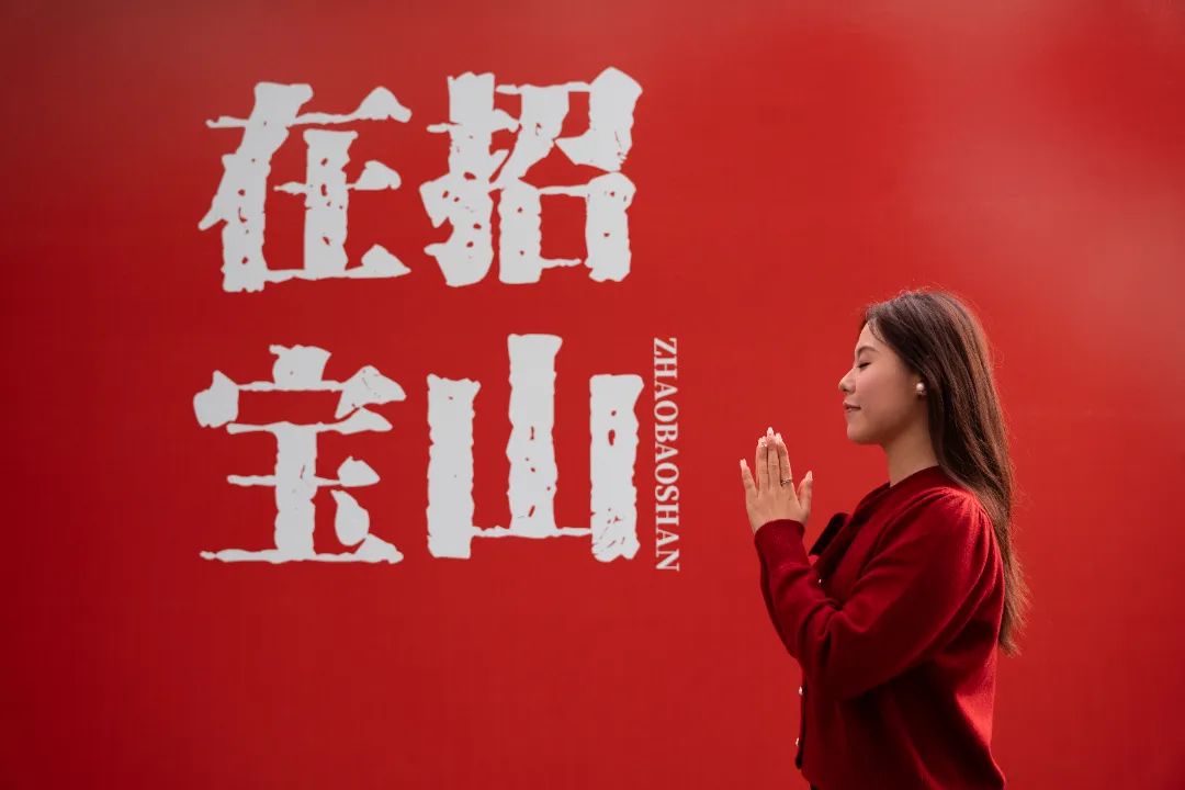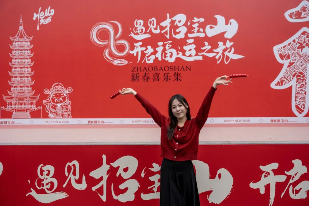 在搭客中心侧面,有一块超等大的“在招宝山”主题布景,合乎凹多样造型,双手合十,心诚则灵,一场充满庆典感的拍照之旅就此盛开。